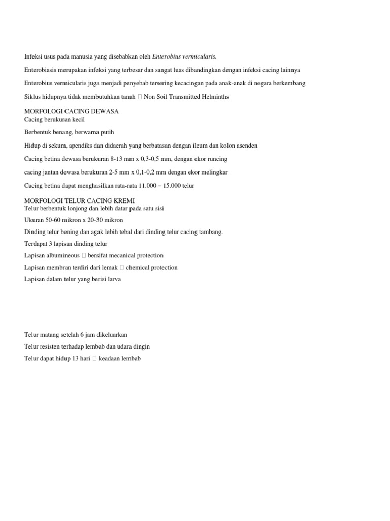 Pada lumen usus, cacing dewasa mendapatkan kebutuhan makanan dengan mudah dan dapat berkopulasi untuk berkembang biak. Cacing dewasa enterobius vermicularis deskripsi cacing dewasa e. Telur cacing enterobius vermicularis (entjang, 2003) 2. Enterobiasis atau oxyuriasis adalah penyakit akibat infeksi cacing e. Cacing enterobius vermicularis menyebabkan infeksi cacing kremi yang disebut juga enterobiasis atau oksiuriasis. Cacing kremi (enterobius vermicularis) adalah cacing yang dapat masuk ke tubuh melalui makanan, pakaian, bantal, sprai serta inhalasi debu yang mengandung telur yang kemudian akan bersarang di usus dan akan dihancurkan oleh enzim usus, telur yang lolos akan berkembang menjadi larva dewasa. Siklus hidup cacing enterobius vermicularis dewasa hidup di lumen colon dan caecum manusia. Morfologi telur cacing kremi (enterobius vermicularis). Infeksi biasanya terjadi melalui 2 tahap. Gambar 2.2 stadium dewasa enterobius vermicularis 2.1.4. Vermicularis berukuran kecil, berwarna putih, yang betina jauh lebih besar dari pada yang jantan. A enterobius vermicularis enterobiasis merupakan penyakit dari enterobiasis vermicularis (oxyuris vermicularis,linnaeus,1785), atau biasa disebut juga pinworm atau cacing kremi. Oxyuris vermicularis adalah nematoda usus yang tipis, putih yang habitatnya di usus besar dan rectum.